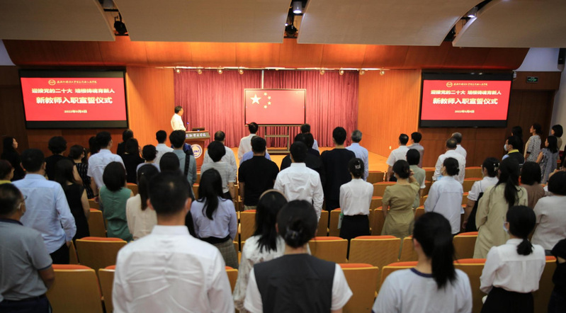 会议首先举行新进教职工入职宣誓仪式,“我志愿做一名光荣的人民教师,忠诚党的教育事业,贯彻党的教育方针,履行教师职责······”,全体新教工在郑方贤校长的带领下,面向国旗,高举右手,庄严宣誓。