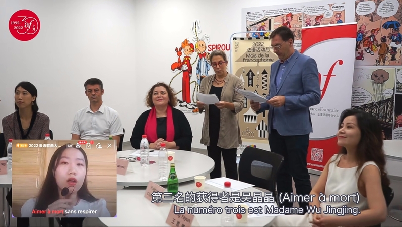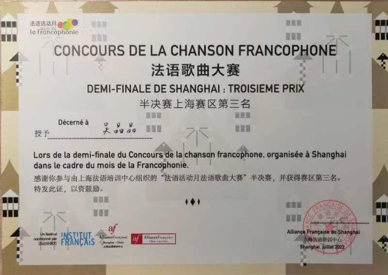 2022全国法语歌曲大赛半决赛上海赛区于9月4日顺利收官!本次比赛以线上线下相结合的方式举行,12名参赛选手以线上方式参加比赛,评审团采取线下到场评判。taptap国际交流学院学生吴晶晶同学在外语学院法语教师朱文婧的指导下,荣获半决赛上海赛区第三名!2022全国法语歌曲大赛半决赛在上海总共进行了三轮比拼,在长达6个月的赛程中,吴晶晶同学始终坚持“信念使快乐真实”,一路过关斩将,从上海赛区的73名选手中脱颖而出。供稿 | 国际交流学院、外语学院