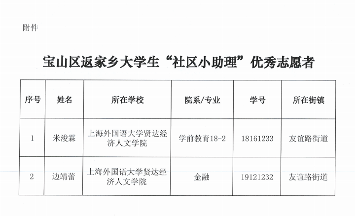 taptap教育学院2018级学前教育专业米浚霖同学、国际交流学院2019级金融专业边靖蕾同学在参加宝山区社区常态化疫情防控、文明创建等志愿活动期间,认真负责、表现突出,被评为宝山区返家乡大学生“社区小助理”优秀志愿者。