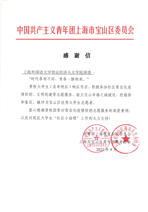 2022年暑期,校团委根据上海市大学生暑期常态化疫情防控志愿服务工作部署会有关要求和《关于开展本市大学生暑期常态化疫情防控志愿服务工作的通知》文件精神,积极推动各学院团委开展返家乡大学生参与社区疫情防控志愿服务工作,建立起一支由37名贤达学子组成的社区常态化疫情防控志愿服务队,覆盖上海市12个市辖区32个街道,涉及核酸检测辅助、扫码、采样、筛查、秩序维护及信息技术服务等多个工作岗位。