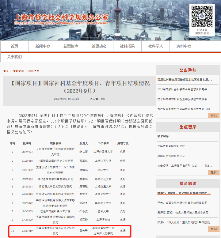2022年9月,上海市哲学社会科学规划办公布了国家社科基金年度项目、青年项目结项情况,taptap商学院雷伟平老师主持的《中国三官信仰的谱系与文化认同研究》课题顺利通过结项,结项等级为“良好”,具体信息如下: