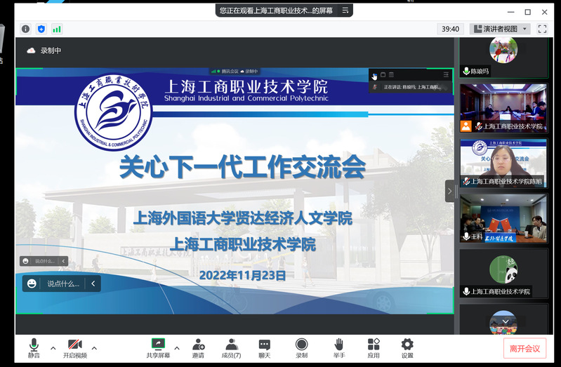 上海工商职业技术学院关工委副主任、党委副书记张中美,上外贤达学院关工委副主任、党委副书记、工会主席郑虹分别交流分享了两校关工委工作推进经验。两校关心下一代工作委员会相关同志参会。
