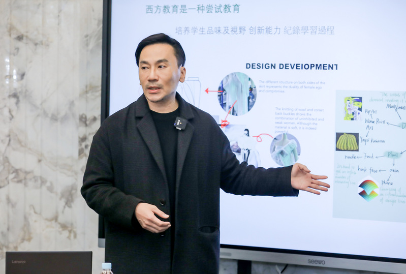 英国创意艺术大学上海联合培养中心课程总监朱原树教授对比了中西方不同的教育方式,展示了中外合作艺术与设计国际化教学成果。他指出,西方教育的目的是让学生发散思维、快乐成长。中式教育更为细腻,潜心耕耘中培养与提升学生的人文艺术素养。