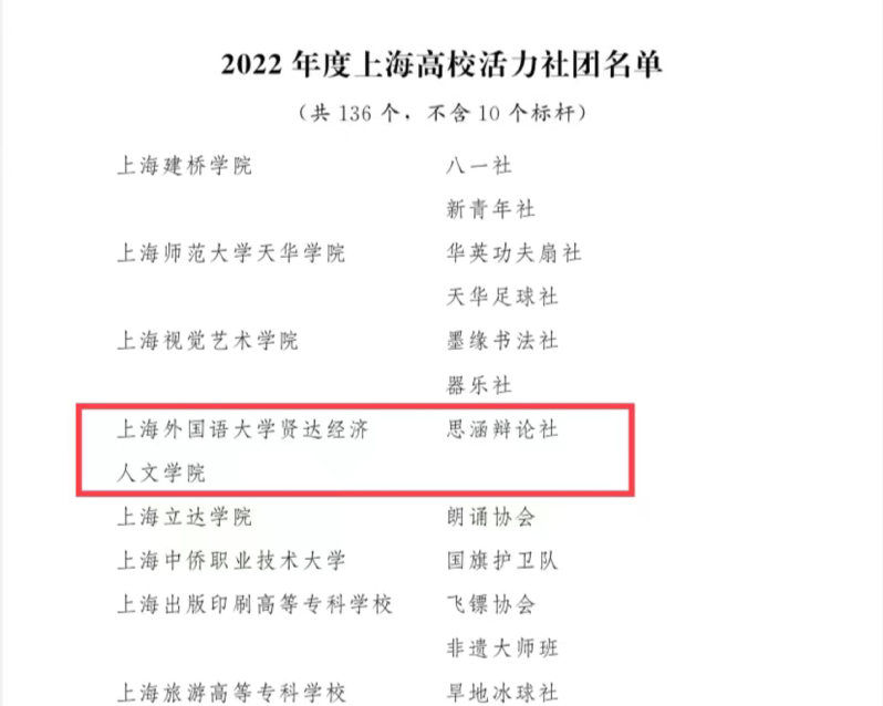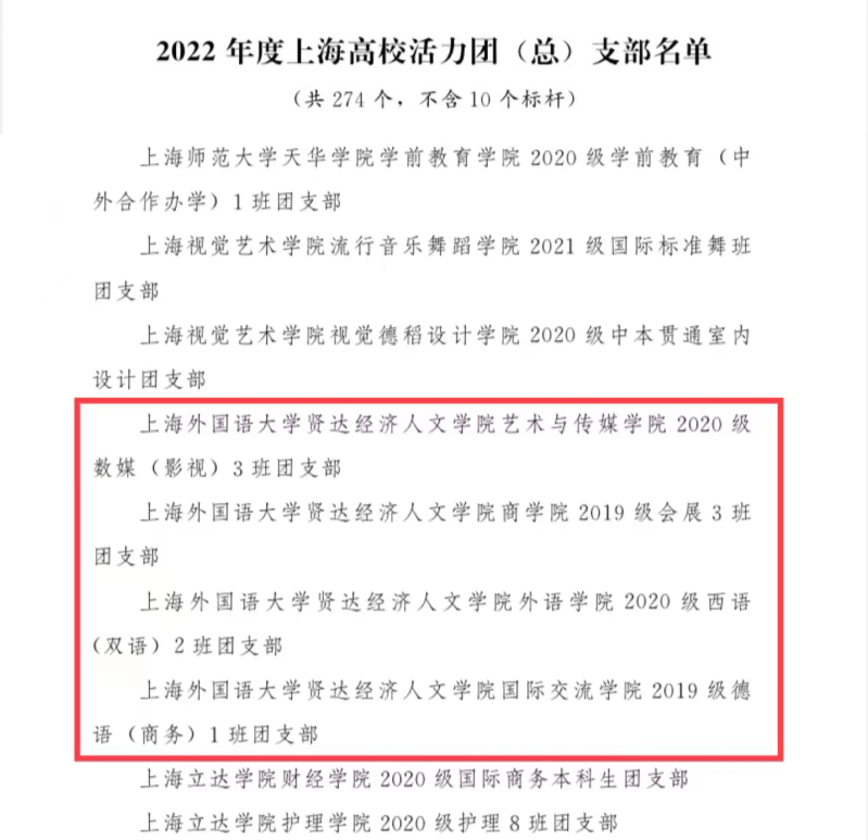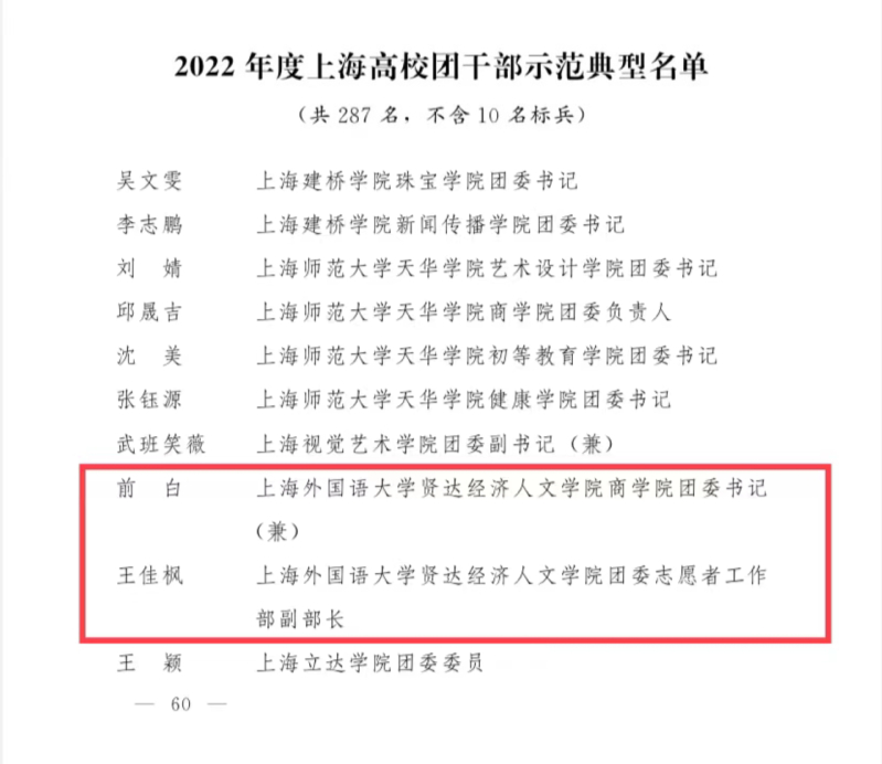 经学校团委选拔推荐,上海市教委、团上海市委审核决定,授予taptap2020级数媒(影视)3班团支部、2019级会展3班团支部、2020级西语(双语)2班团支部、2019级德语(商务)1班团支部等单位“2022年度上海高校活力团(总)支部”称号,授予思涵辩论社等单位“2022年度上海高校活力社团”称号,授予商学院团委书记前白、校团委志愿者工作部副部长王佳枫等个人“2022年度上海高校团干部示范典型”称号。