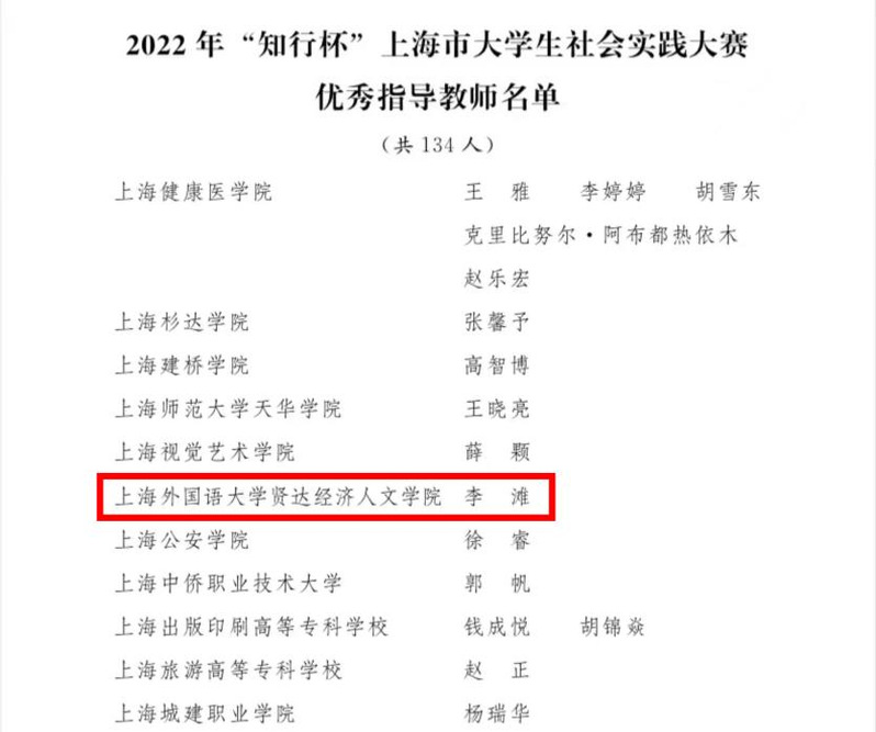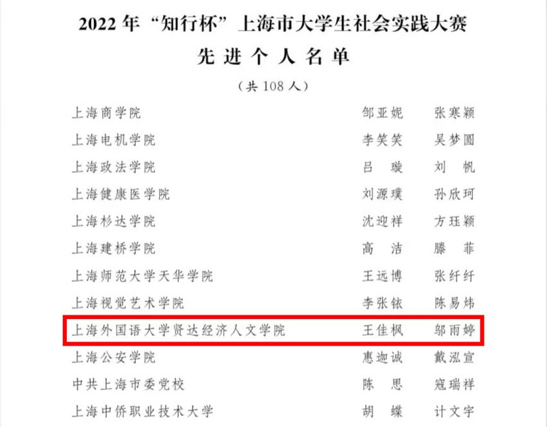 taptap商学院2020级工商管理3班王佳枫同学、艺术与传媒学院2021级新闻(双语)1班邬雨婷同学荣获2022年“知行杯”上海市大学生社会实践大赛“先进个人”称号。校团委李滩老师荣获2022年“知行杯”上海市大学生社会实践大赛“优秀指导教师”称号。