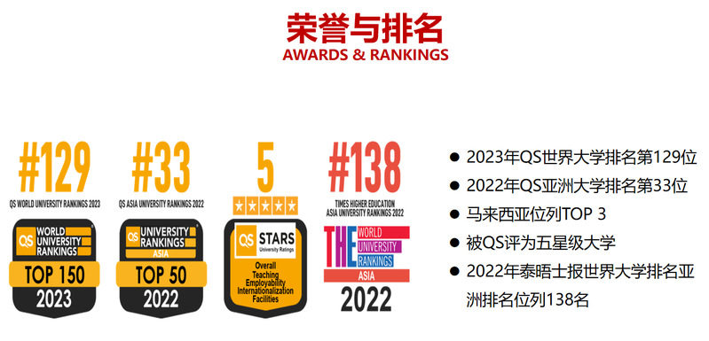 马来西亚国立大学,简称UKM,始建于1970年,是一所综合型大学,共有13个学院。UKM专业非常广泛,有文、理、工、商、医科等各类专业,除此之外还有诸多中心及研究所。2023年QS世界大学排名第129,同时被QS评为五星级大学,马来西亚国内排名位列前三。获得国际商学院协会(AACSB)官方认证;获得21世纪管理教育与学术联盟(ABEST21)官方认证;获得马来西亚学术资格鉴定机构(MQA)认证。