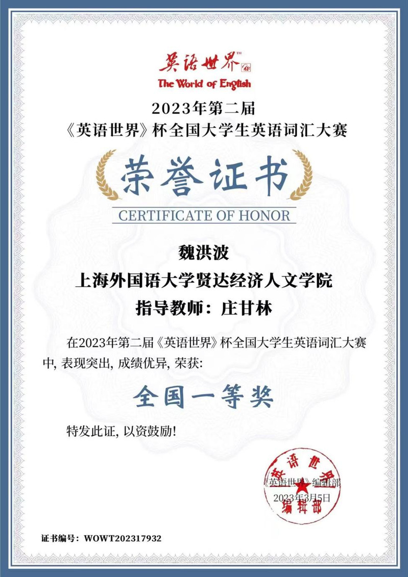 外院2022级英语4班学生魏洪波在2023年第二届《英语世界》杯全国大学生英语词汇大赛中脱颖而出,荣获一等奖。