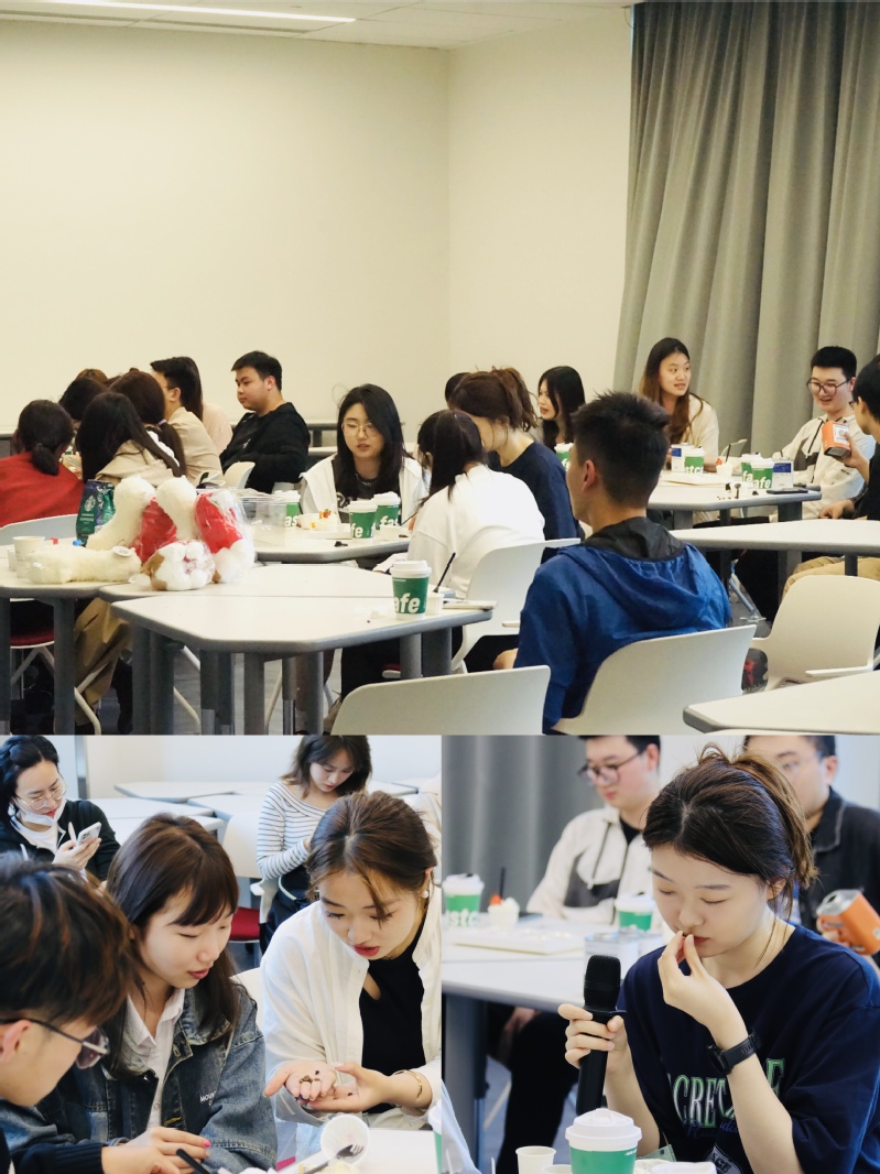 了解完咖啡文化起源,何老师简单分享了咖啡机的种类和工作原理,并邀请与会同学亲自品味不同品种的咖啡豆,感受来自不同国度、种植区域咖啡豆的芬芳香气,同时邀请同学们实际操作制作一杯新鲜可口的现磨咖啡,现场同学们仔细观看咖啡的制作过程,并认真聆听何老师的讲解。当现磨咖啡制作完成,在场的每位同学都跃跃欲试,希望能品尝到自制的现磨咖啡。期间,国交处的老师们为所有与会同学分发提前准备好的latte和cupcakes,让同学们可以直观地体会到现磨咖啡、成品咖啡和速溶咖啡不同的口感和风味差异。