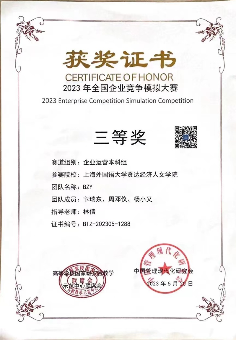 近日,由中国管理现代化研究会、高等学校国家级实验教学示范中心联席会经管学科组共同指导,中国管理现代化研究会决策模拟专业委员会主办的“全国企业竞争模拟大赛”圆满落幕。taptap商学院工商管理系林倩老师带领5支学生团队参赛,其中MDY队(李梦圆、谷源龙、马贤)荣获全国二等奖,BZY队(卞瑞东、周邓仪、杨小又)荣获三等奖。