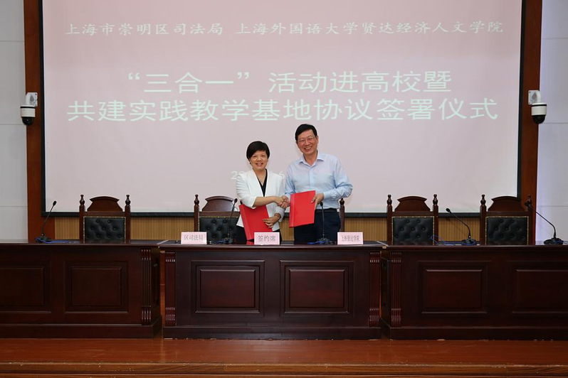 庭审结束后,上海市崇明区司法局党组书记、局长时枫与校长郑方贤签订“三合一”活动进高校协议暨共建实践教学基地协议。