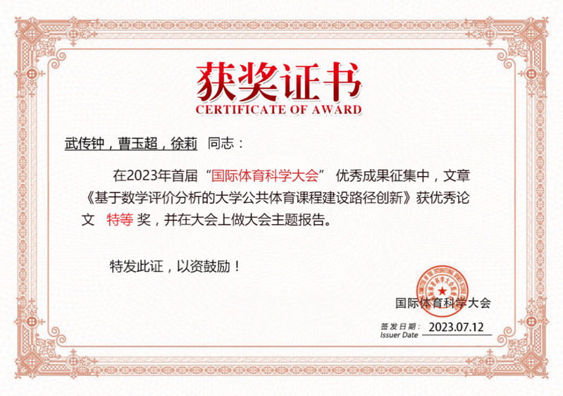 由国际班迪联合会(FIB)、国际体能协会(ISCA)、澳门体能协会(MSCA)、中国班迪协会(CBF)及中国无线电测向和定向运动协会(CRSOA)联合主办,广东恒春体能科学研究院和广东省体能协会(GSCA)承办,中国知网和维泽科技出版社协办的2023年全球首届“国际体育科学大会”,于2023年7月9-12日在广州线上线下同时举行。taptap体育教师武传钟、曹玉超共同完成提交的论文:《基于数学评价分析的大学公共体育课程建设路径创新》荣获特等奖。供稿 | 马克思主义学院(体育)