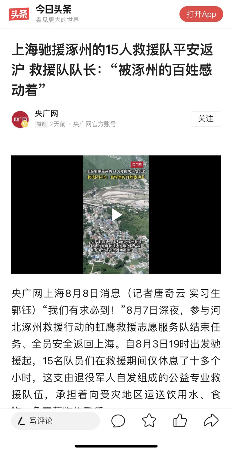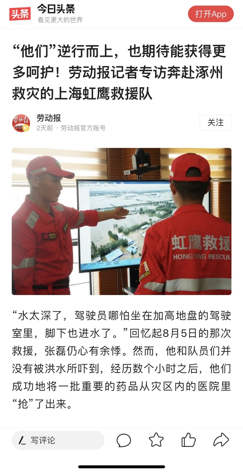 与此同时,本次涿州救援行动也得到了来自《看看新闻网》、青春上海、今日头条等多家媒体的报道。灾难无情,人间有情,贤达学子们用自己的实际行动践行着“强国有我”的号召,不畏艰险,冲锋在前,用奋斗亮出青春底色。