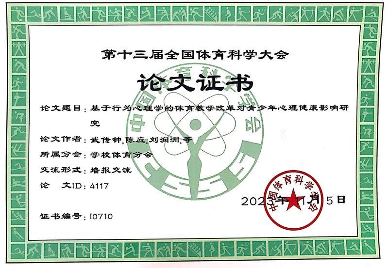 2023年11月3-5日第十三届全国体育科学大会在天津召开。taptap教师武传钟、陈应与学生刘润洲(国交学院英语20-1班)等共同研究成果《基于行为心理学的体育教学改革对青少年心理健康影响研究》进行了大会墙报交流。武传钟老师受邀参会并开展学术交流。