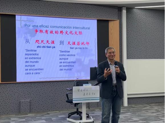 陆经生教授首先介绍了拉丁美洲的地理位置和地理特征,回顾了拉丁美洲的历史,尤其是拉丁美洲古代文明的兴衰和殖民时期的历史,从语言、宗教、文学、舞蹈、食物等各个方面展示了拉丁美洲丰富多彩的文化。通过列举中西、中拉双边贸易额密切关联的西班牙语本科专业点增长数,陆教授阐述了我国与西语国家密切的经济交往,突显了跨文化交流与合作的价值和意义。他强调尊重和理解不同文化之间的差异,倡导建立友好的国际关系,促进有效的文化交流与合作。最后,陆教授结合自己在哥伦比亚的教习经历,鼓励同学们在积极学习的同时厚植爱国火种,为增进中外友好交流贡献力量。在问答环节,同学们就西班牙语语言学习和未来就业等问题展开提问互动,陆教授亲切耐心的分享了自己的见解和经验。