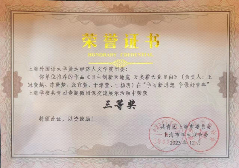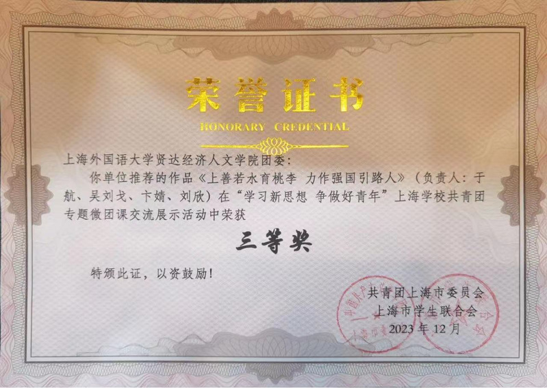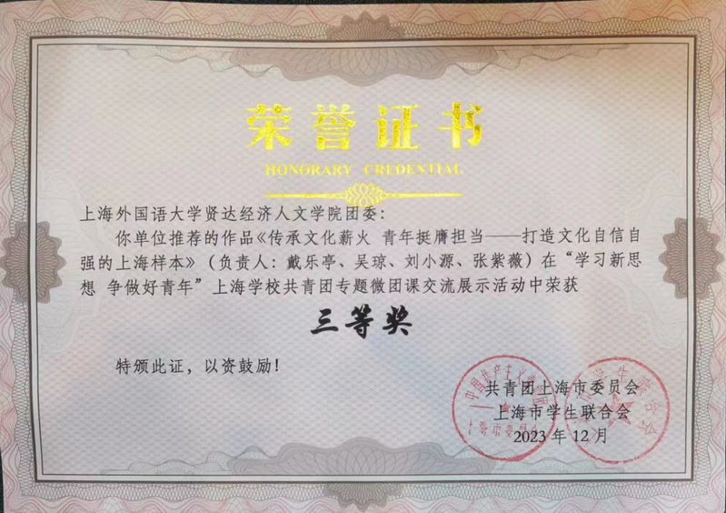 前期,校团委在青年师生中积极动员,深入开展专题微团课评选推荐工作,taptap师生积极响应,经各基层团支部申报、校团委遴选推荐、市级评审,青年教师团支部(国际交流学院教师)微团课《传承文化薪火 青年挺膺担当——打造文化自信自强的上海样本》、外语学院团委微团课《自主创新天地宽 万类霜天竞自由》、商学院微团课《上善若水育桃李 力作强国引路人》等作品在“学习新思想 争做好青年”上海学校共青团专题微团课交流展示活动中荣获三等奖。