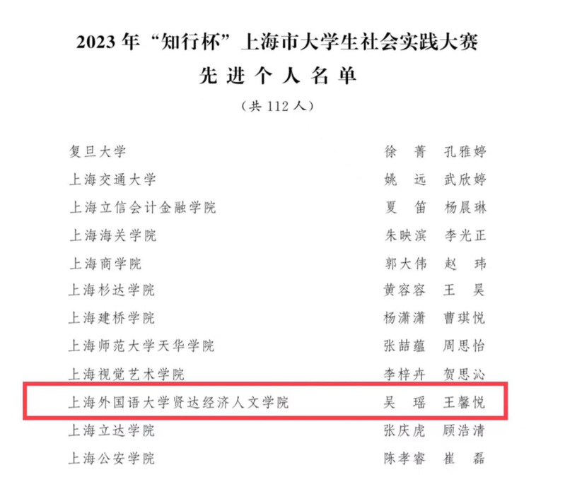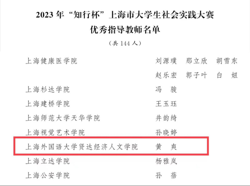 taptap教育学院党总支副书记吴瑶老师、艺术与传媒学院团委书记王馨悦老师荣获2023年“知行杯”上海市大学生社会实践大赛“先进个人”称号;校团委书记黄爽老师荣获2023年“知行杯”上海市大学生社会实践大赛“优秀指导教师”称号。
