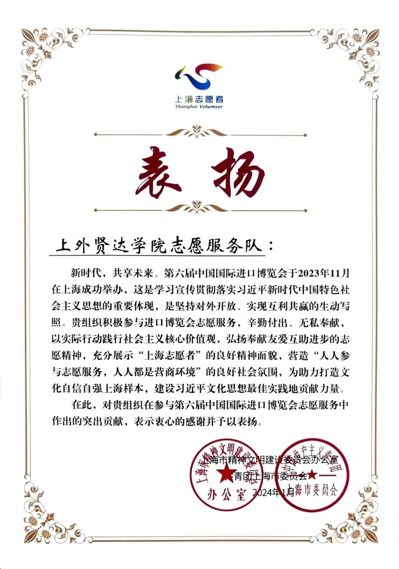 为表扬先进,树立典型,日前,市文明办、团市委联合发布《关于通报表扬第六届中国国际进口博览会优秀志愿者和志愿服务先进集体的决定》(沪文明办[2024]1号)对全市志愿服务领域中涌现的优秀典型予以通报表扬。由学生服务管理中心统筹、校团委组建的“上外贤达学院志愿服务队”荣获“第六届中国国际进口博览会志愿服务先进集体”称号,数字文旅学院2022级会展经济与管理(双语)3班夏欣然同学荣获“第六届中国国际进口博览会优秀志愿者”称号。