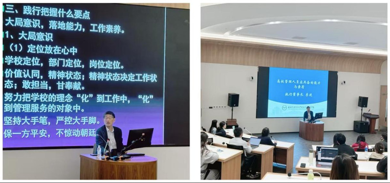 高等教育管理领域资深学者、校董事会执行董事长李进教授,以“高校管理人员能力与素质的养成”为主题为本次培训作开篇报告。他围绕“培训目的”“工作要求”“践行要点”三个方面,详尽剖析了高校管理人员能力与素质的提升核心。他强调,作为贤达教职工,需具备大局意识、落地能力和良好的工作素养。同时,他分享了“十句箴言”并提炼出四大工作法宝:“德艺语技”——“德”即大局意识,“艺”即积极的人际关系,“语”即良好的语言应用能力,“技”即扎实的专业技能。李进执行董事长在报告中明确指出,“最好的服务是指导,指导的底气是政策经验”他以此勉励所有教职工在未来共同践行,实现长足进步。