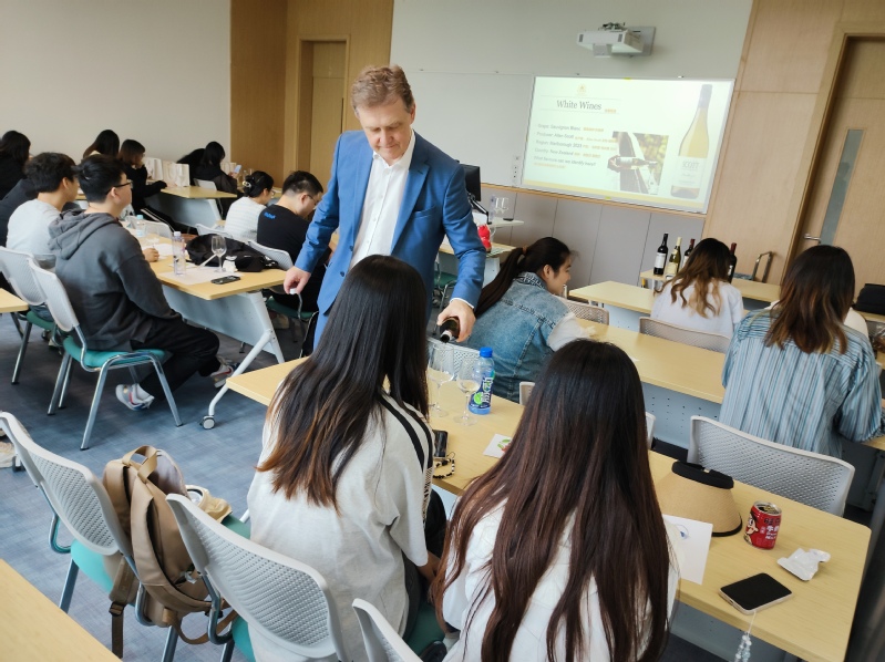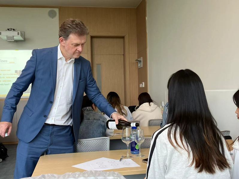 Workshop伊始,Simon Thompson教授向同学们介绍了不同产地葡萄酒的品质、口感、风格差异,分享了挑选、品鉴技巧和食物搭配等实用技巧。同学们从中了解到了关于葡萄酒及其饮用礼仪的知识,包括葡萄品种、产地差异、酒塞和酒标的分类、葡萄酒的开瓶和饮用礼仪等。随后,Simon Thompson教授邀请同学们观察、品鉴不同产地不同类别葡萄酒。在场的同学们在聆听讲解的同时,仔细观看葡萄酒的颜色并品尝,感受不同原料、不同产地的葡萄酒之间的细微差异,直观地体会到不同葡萄酒所带来的独特口感和风味。