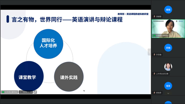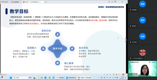 此次主题说课是外语学院近年来开展的又一次创新教学活动。在教学理念上,融合国际化视野,强调语言技能与专业应用紧密结合,学以致用,在教学手段上,采取实战模拟、项目驱动,增强学生实战能力、合作能力以及综合应用能力。我们热切期盼外语学院有更多的教师走向教育部“英语课程群虚拟教研室”的平台,展示教学风采,为校争光添彩!