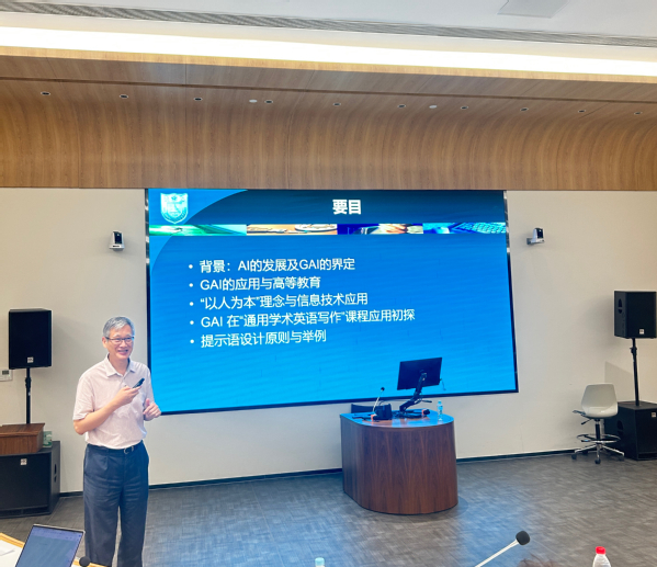在讲座中,王教授展示他在“通用学术英语写作”课程中运用生成式人工智能(GAI)的实践经验,深入分析了生成式人工智能技术与大学英语教学相结合的路径与方法,探讨了其在提升学生学习体验、优化教学资源配置以及促进个性化教学等方面的应用潜力。