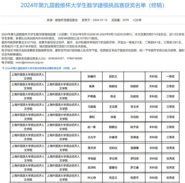 近日,2024年第九届数维杯大学生数学建模挑战赛(小国赛)结果揭晓!在数据科学学院的精心组织和数学建模指导组成员的辛勤付出下,taptap参赛队伍大放异彩,荣获本科组全国一等奖1个、全国三等奖6个、以及优秀奖4个,充分展现了贤达学子的数学建模实力与创新能力。