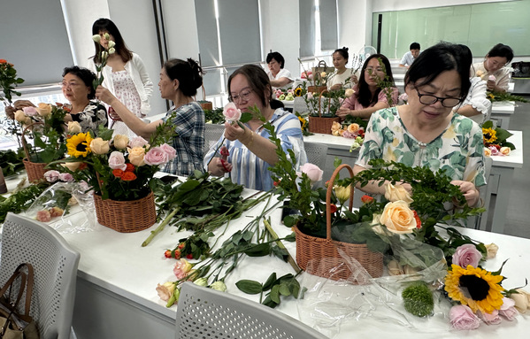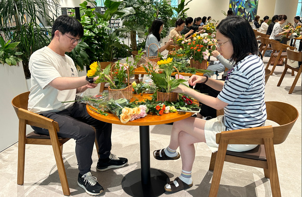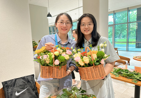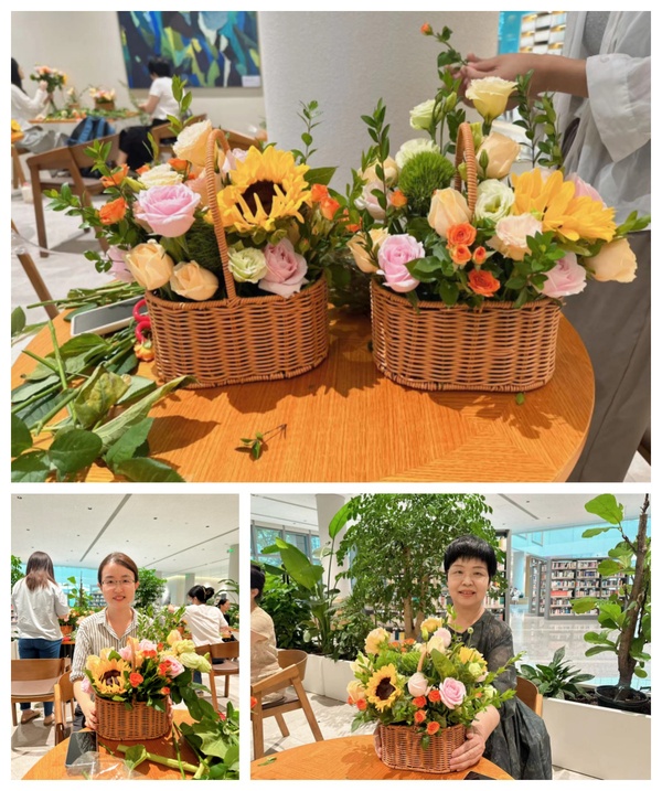 活动中,花艺老师向现场教师们介绍了常见的花种、花语和插花基本花型和小技巧。置身于绚烂的花丛中,教师们一边聆听专业讲解,一边构思着自己的设计。随后,在花艺老师的指导下,他们各自拿起剪刀对手边的鲜花进行细致的修剪,并插入花泥中,透露出对艺术和审美的追求。在她们灵巧的双手下,一个个造型各异的花篮呈现在大家面前,或格调高雅,或清新可人,或雍容富贵,触动了现场每一个人的心灵,让人沉醉不已。