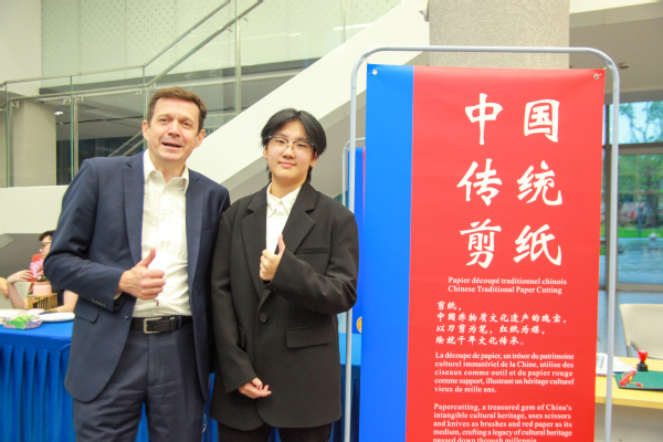 参观结束后,昂热高商师生前往国交楼一层大厅参加了主题文化交流活动。活动以游园会形式开展,其中包括京剧脸谱绘画、中国茶艺展示、中国传统游戏闯关、中国传统服饰体验、剪纸体验、书法体验、冷餐会交流等7个项目。