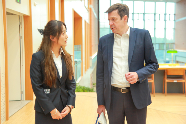 首先,梁副校长致欢迎辞。她对法国昂热高等商学院(ESSCA)师生代表团的到来表示热烈欢迎,并希望双方师生借此契机加强常态化沟通交流,在提升学生跨文化应用实践能力的基础上,为中法文明交流互鉴做出努力。