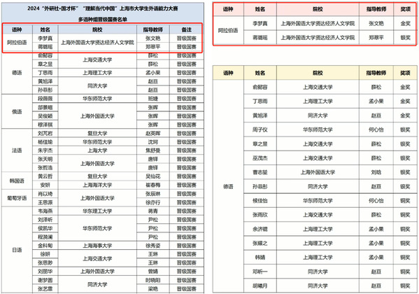 阿拉伯语组上海市赛赛题涵盖阅读理解、完形填空、阿汉互译、写作、演讲等多种形式。李梦真和蒋璐瑶同学在赛前认真备赛,在指导老师郑翠平、张文艳老师的指导下,多次对演讲稿进行打磨、润色,最终凭借扎实的阿拉伯语语言基础知识、良好的语言表达能力,在赛场发挥出色,取得了上海市赛金、银奖项,晋级国赛的好成绩。