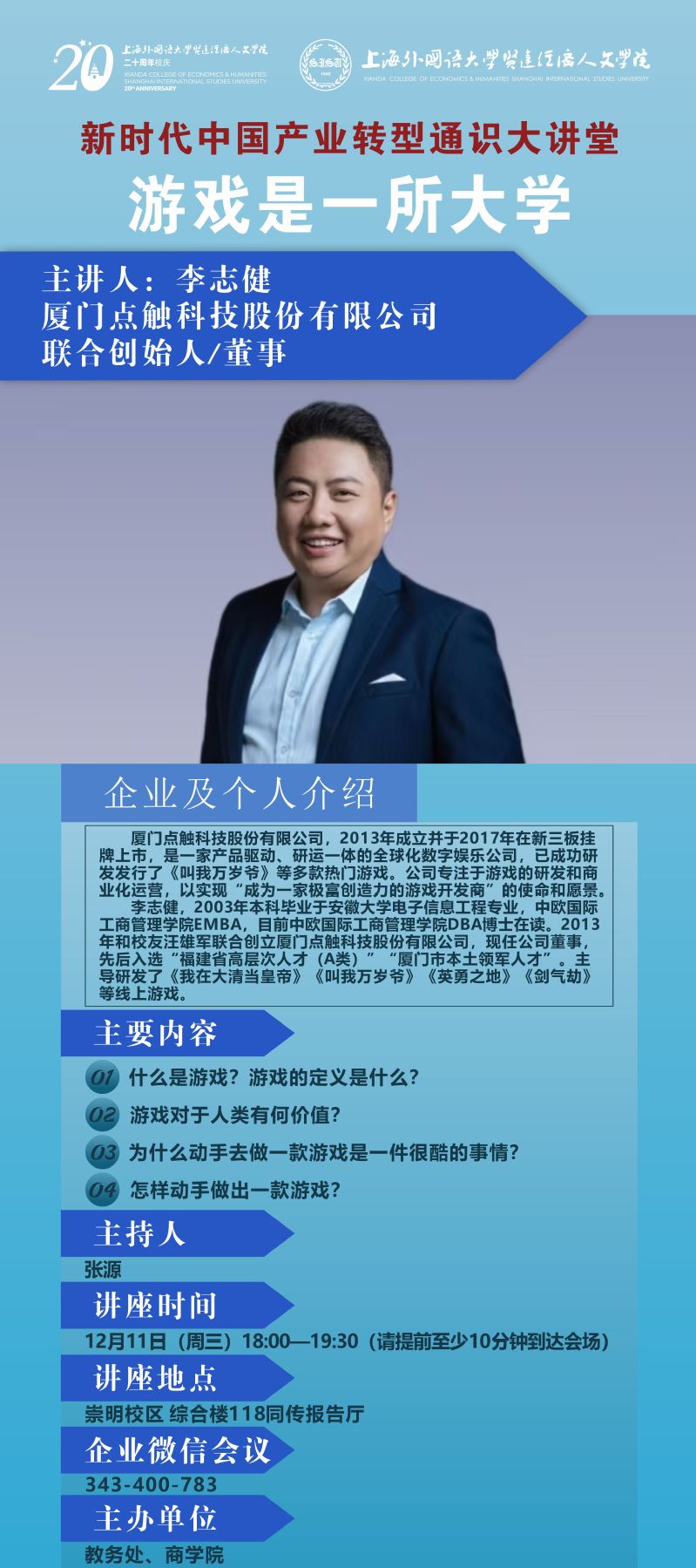 12月11日 李志健:游戏是一所大学(新时代中国产业转型通识大讲堂)