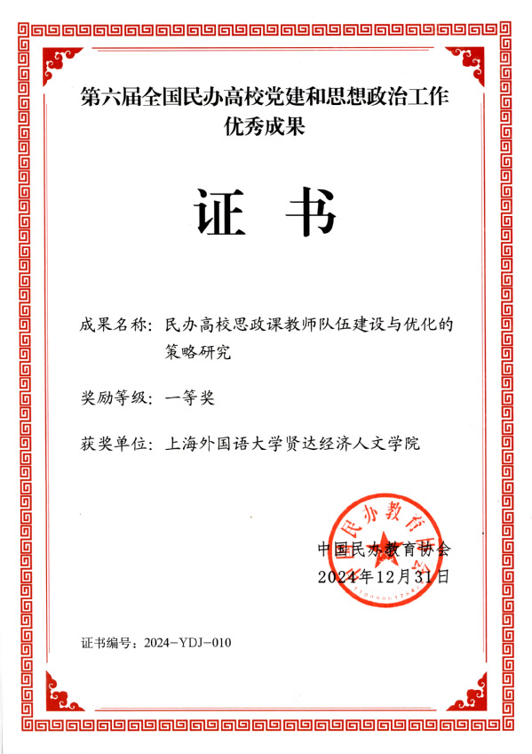 大会表彰了一批在民办教育领域做出突出贡献的机构和个人。杨述厚教授完成的“民办高校思政课教师队伍建设与优化的策略研究”获第六届全国民办高校党建和思想政治工作优秀成果一等奖,是上海民办高校此次获得的二个一等奖之一,填补了taptap在该奖项上的空白。