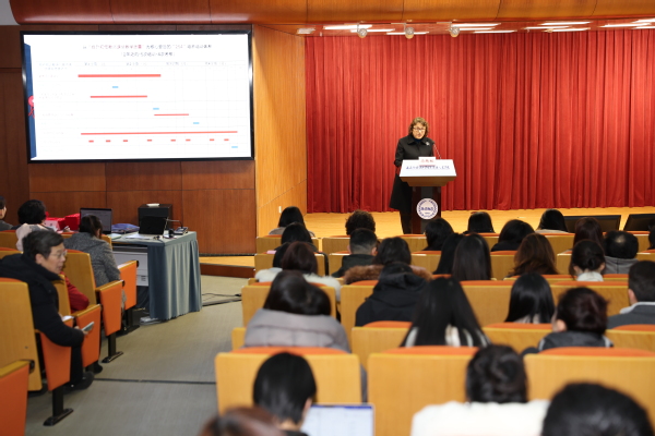 郑虹副书记以《以章程为核心的现代大学制度建设与运行》为题,介绍了学校积极践行现代大学制度,持续完善治理结构、组织架构、院校两级管理体系,保障学校民主管理的各项举措。她还分享了工会服务的具体内容,让在场的新教工们倍感温馨和欢乐。