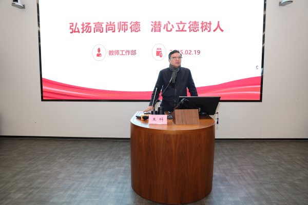王科副书记作《弘扬高尚师德,潜心立德树人》的专题报告,带领教职工学习领会习近平总书记关于教育重要论述的科学内涵、精神实质,通过剖析违反教师职业行为的典型案例,要求教职工严格遵守《新时代高校教师职业行为十项准则》,勇担立德树人重任,争做新时代青春引路人。