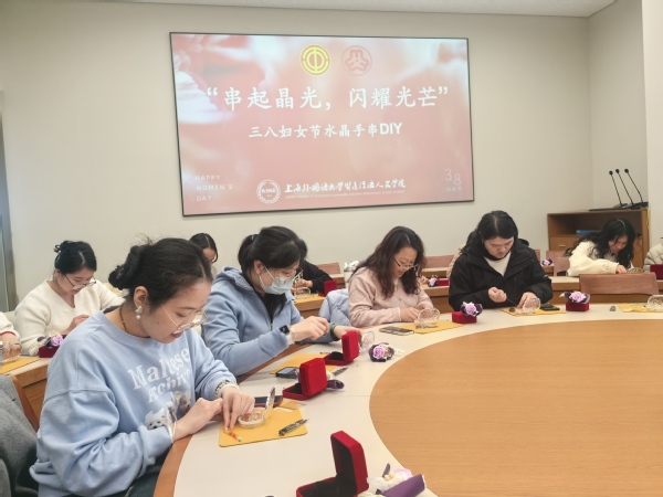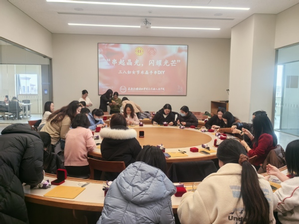 3 月 6 日下午,崇明校区图书馆308室热闹非凡,30多位女教职工体验了一场“串起晶光,闪耀光芒”水晶手串DIY活动。工作人员展示琳琅满目的水晶珠子和串珠工具,并演示基本技巧。大家在轻松氛围中发挥想象力,串成独一无二的手链。现场欢声笑语不断,每一串手链都闪耀着独特光芒,正如女教职工们的自信与魅力。
