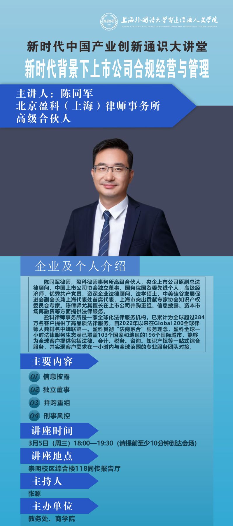 3月5日 陈同军:新时代背景下上市公司合规经营与管理(新时代中国产业创新通识大讲堂)