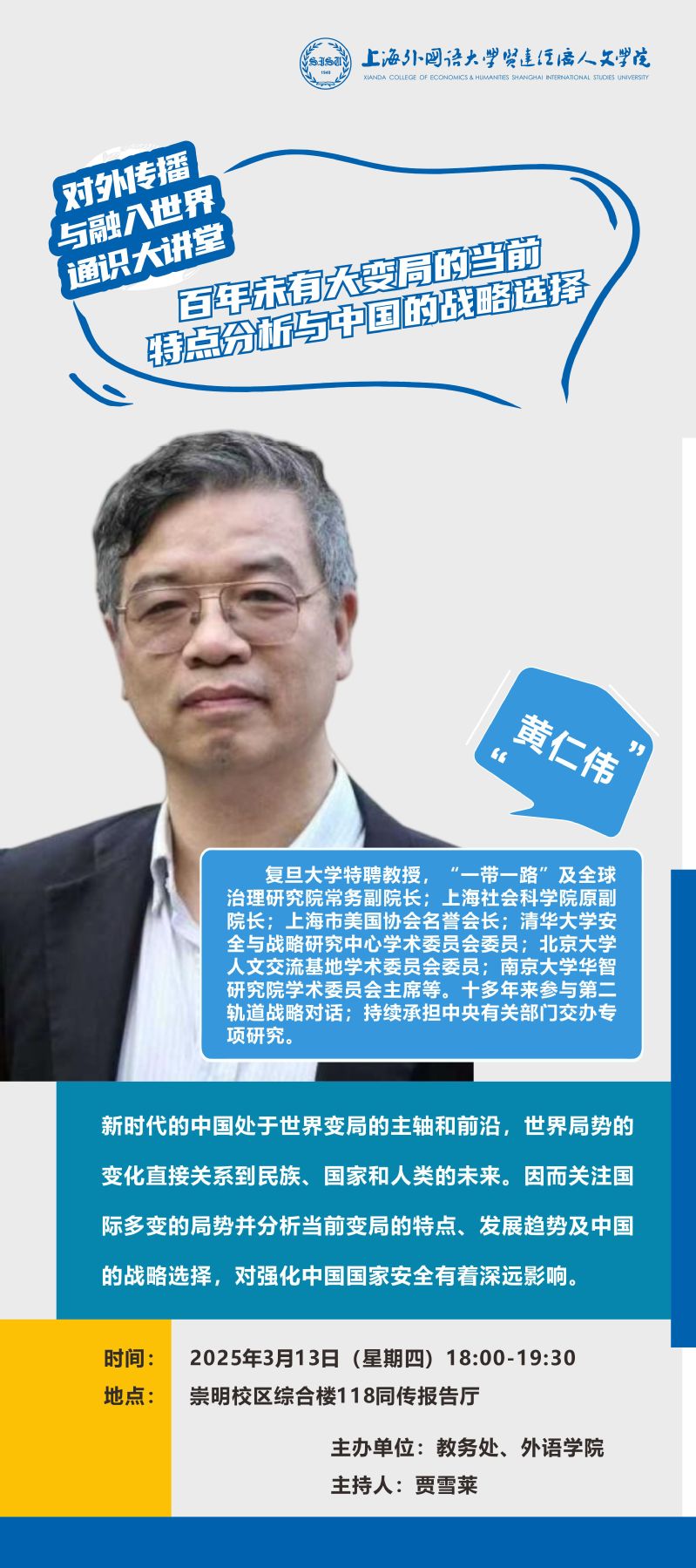 3月13日 黄仁伟:百年未有大变局的当前特点分析与中国的战略选择(对外传播与融入世界通识大讲堂)