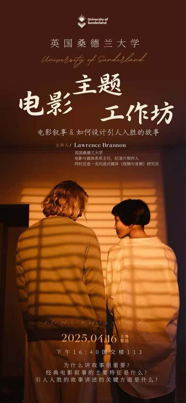 4月16日下午,英国桑德兰大学艺术与创意产业学院电影与媒体系系主任Lawrence Brannon教授,为上外贤达学院艺术与传媒学院的学生带来了一场别开生面的,主题为“电影叙事艺术与引人入胜的故事设计” 的workshop活动。此次活动旨在通过理论与实践相结合的方式,引导学生探索电影叙事的奥秘,并激发创作出富有吸引力的叙事作品。
