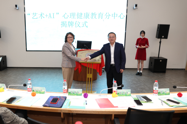 紧接着,校党委书记赵荣善和副校长马艳红共同为“艺术+AI”心理健康教育分中心揭牌,现场响起了热烈的掌声。赵书记在随后的讲话中,对分中心的工作提出了期望与要求,他强调要进一步提高政治站位,深刻认识到心理健康教育工作的重要意义,始终把学生的需求放在首位,加强宣传引导,营造良好的校园心理健康教育氛围,并强化专业建设与团队赋能。