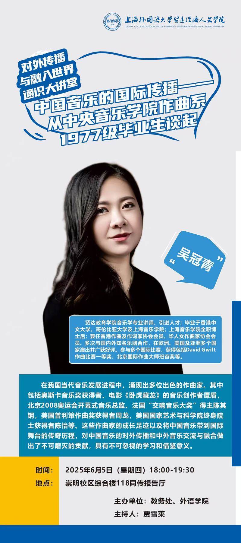 6月5日 吴冠青:中国音乐的国际传播——从中央音乐学院作曲系1977级毕业生谈起(对外传播与融入世界通识大讲堂)
