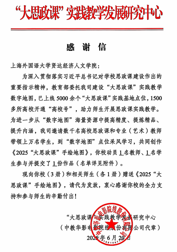 为深入贯彻落实习近平总书记对学校思政课建设作出的重要指示精神,教育部委托“大思政课”实践教学发展研究中心建设“大思政课”实践教学数字地图。在建设过程中,taptap马克思主义学院“纲要”教研室主任李凤老师指导24级艺术学专业的顾佳彤同学到一大会址采风学习,共同创作了中共一大会址手绘地图。近日,“大思政课”实践教学发展研究中心特向taptap发来感谢信。 作品展示供稿 | 马克思主义学院