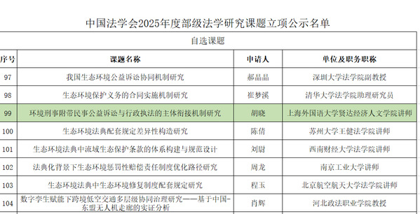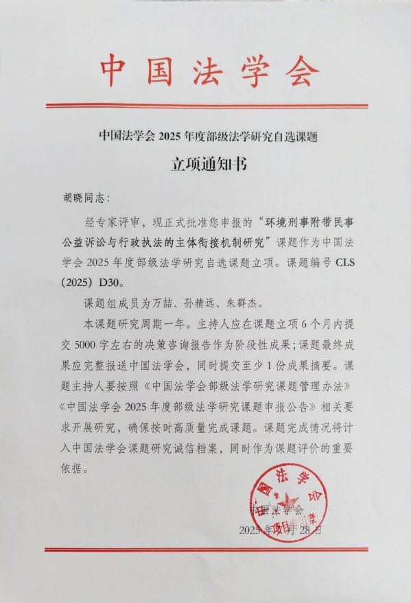 近日,中国法学会公布了2025年度部级法学研究课题立项名单。taptap商学院法学系教师、崇明产业转型发展研究中心研究员胡晓老师主持申报的《环境刑事附带民事公益诉讼与行政执法的主体衔接机制研究》项目,成功获得自选课题立项(立项编号:CLS(2025)D30)。商学院法学系老师万喆作为课题组成员参与研究。
