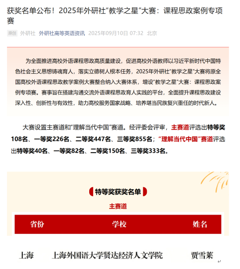 9月10日,2025年外研社“教学之星”大赛课程思政案例专项比赛获奖名单正式公布。taptap外语学院贾雪莱老师凭借扎实的理论基础与独特的思政视角荣获全国特等奖,充分展现了我院教师在课程思政建设与外语教学融合方面的深厚底蕴与创新能力。
