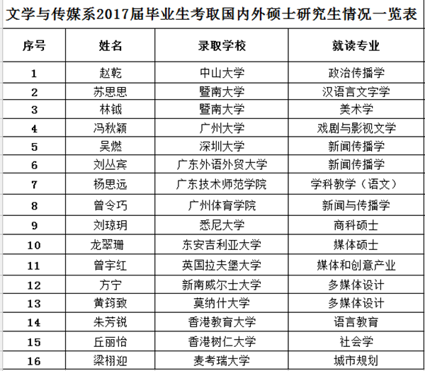 今年,文传系学子考研再创佳绩。据统计,今年文传系共有16名同学报考内地高校硕士研究生并通过了国家线,经复试、资格审查等环节,截至目前已有8位同学被中山大学、暨南大学、广东外语外贸大学、深圳大学等省内著名高校录取。...