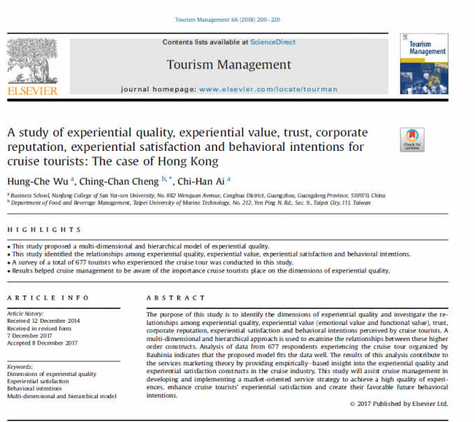 beat365商学院吴宏哲老师、艾之涵老师与台湾学者合作的论文“A study of experiential quality, experiential value, trust, corporate reputation, experiential satisfaction and behavioral intentions for cruise tourists:...