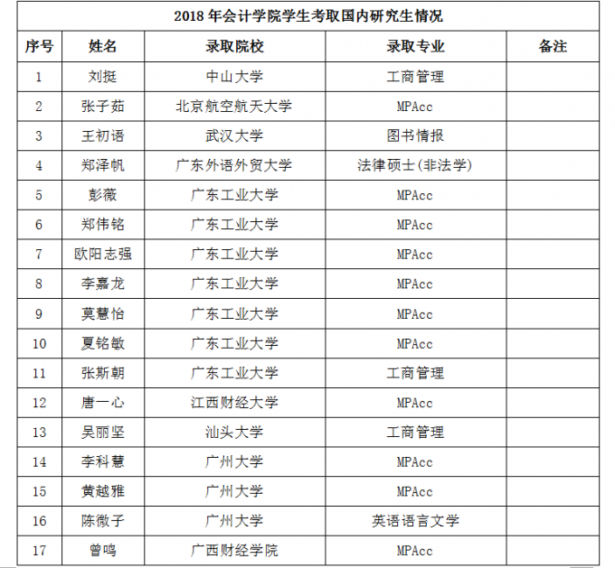 在2018年研究生招生考试中,会计学院学生再创佳绩,共50多名同学的分数超过国家线,其中张子茹等17名同学被中山大学、北京航空航天大学、广东外语外贸大学、广东工业大学、江西财经大学等国内知名高校拟录取,将进入更高层次的深造。...