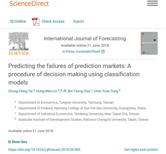 中山大学南方学院商学院林鸿文老师在SSCI顶尖预测类期刊International Journal of Forecasting刊登论文:“Predicting the failures of prediction markets: A procedure of decision making using classification ...