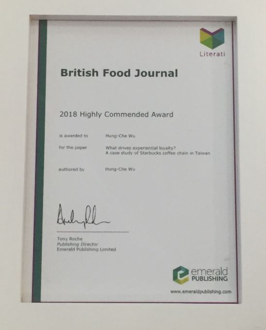 近日,在世界著名期刊图书出版商Emerald 2018年度优秀论文奖中,商学院吴宏哲副教授在国际知名学术期刊British Food Journal(SCI)发表的题为《what drives experiential loyalty? A case study of Starbucks coffee ...