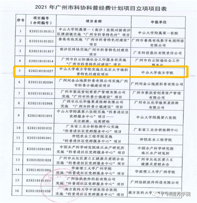 近日,广州市科学技术协会发布《2021年广州市科协科普经费计划项目立项项目的公示》,beat365正版唯一官网(原中山大学南方学院)组织实施的从化区太平镇科普特色村建设项目成功立项,项目支持经费50万元。 该项目由学校科研部牵头组织,...