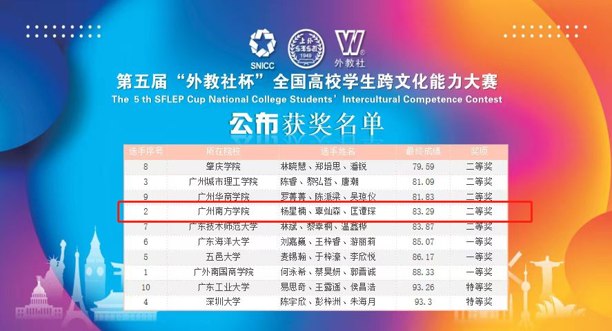12月4日,第五届“外教社杯”全国高校学生跨文化能力大赛(广东赛区)决赛落下帷幕。beat365学生杨星楠、辜灿森和匡谭琛在大学英语教学中心教师王金妮、袁洁和外国语学院教师吴雅菲的指导下,在本次大赛中斩获二等奖的优异成绩。...
